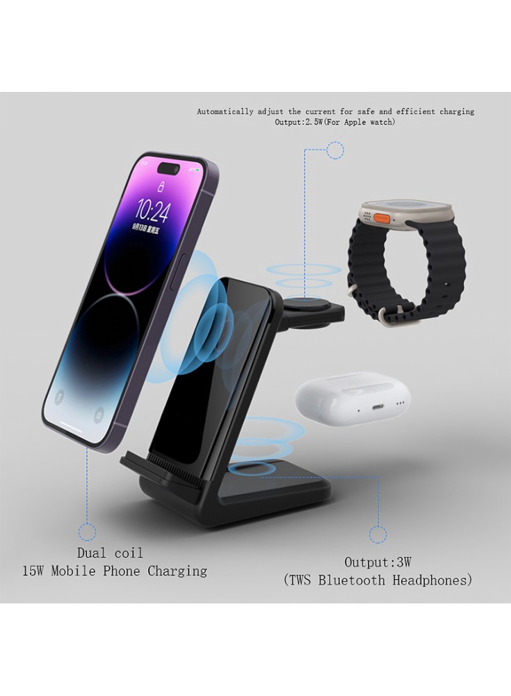 This wireless charging dock provides an efficient and convenient solution for all your multi-device charging needs. It supports a variety of devices, including iPhones, wireless earbuds, and smartwatches, with a maximum output power of 15W, ensuring faster and more stable charging. Whether for daily use or work scenarios, it easily meets the demands of charging multiple devices.